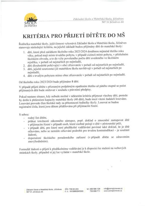 Vážení rodiče, zveme Vás a Vaše děti k přijímacímu řízení do MŠ pro školní rok 2023/2024. Všechny potřebné informace jsou přiloženy.