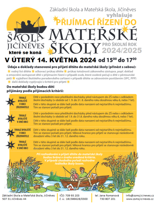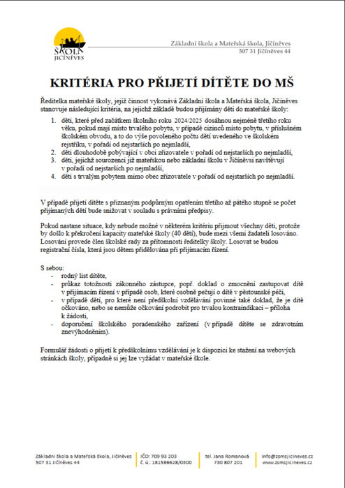 Vážení rodiče, zveme Vás a Vaše děti k přijímacímu řízení do MŠ pro školní rok 2024/2025. Všechny potřebné informace jsou přiloženy.