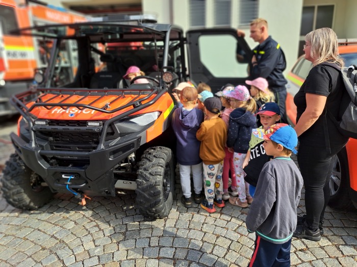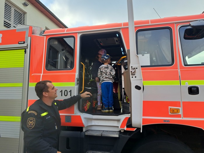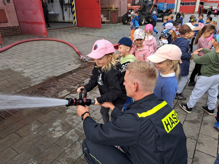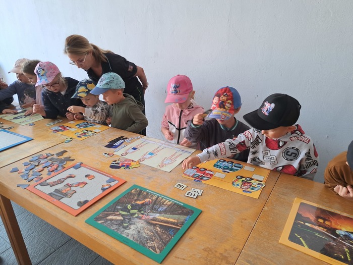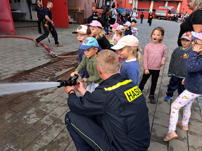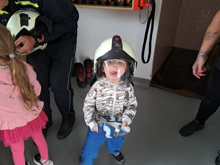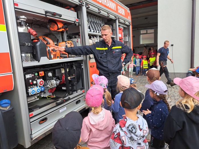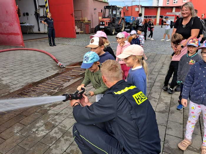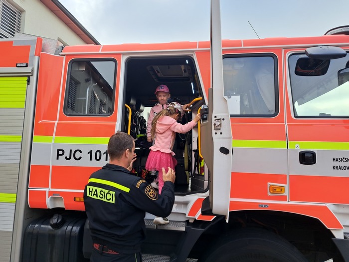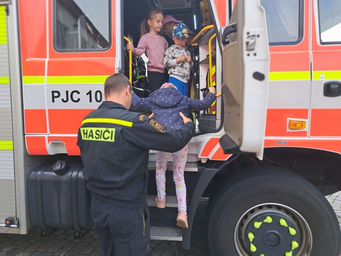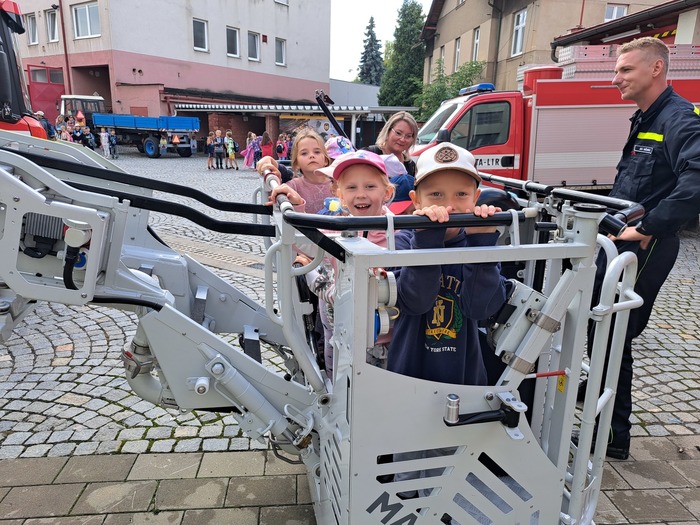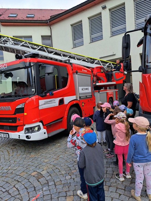 Ve čtvrtek 11. 9. 2025 děti ze třídy Hvězdička vyrazily vláčkem do Jičína. Když je festival Jičín - město pohádky, mají hasiči vždy pro děti připravenou techniku a další aktivity. Tatínek Magdalénky u hasičů pracuje a tak už na nás čekal, až nás přiveze vláček. Dětem ukázal hasičskou techniku, přístroje i výbavu. Ukázal dětem, jak pracuje vysokozdvižná plošina, děti si zastříkaly stříkačkou a nakonec se dokonce svezly i hasičským profesionálním vozidlem. Na jaře až vyrostou naši mladší kamarádi se k hasičům podíváme ještě jednou se všemi kamarády.